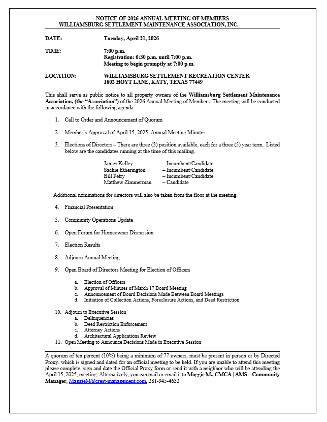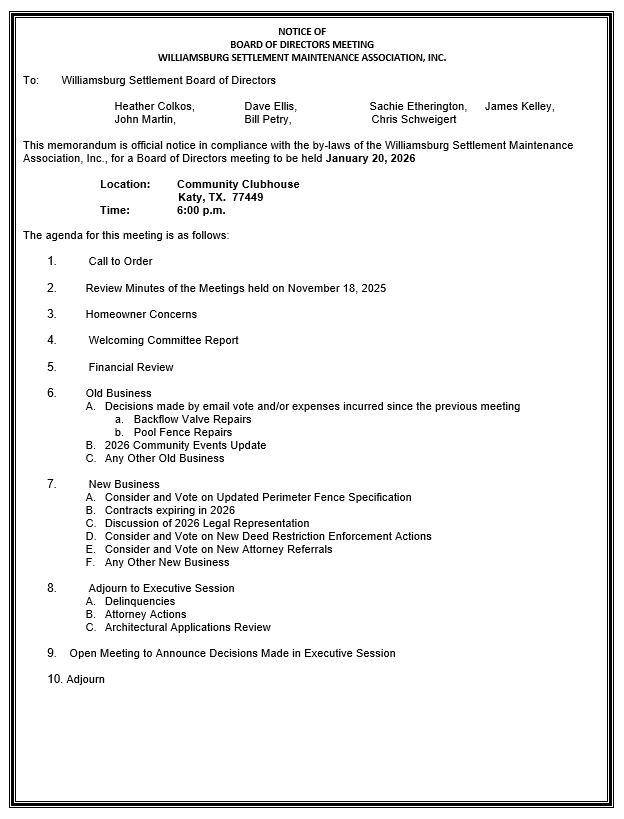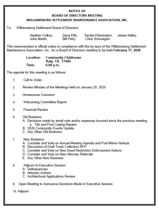 Board meetings are held on the third Tuesday of each month at the Williamsburg Settlement Clubhouse located at 1602 Hoyt, Katy, TX 77449.