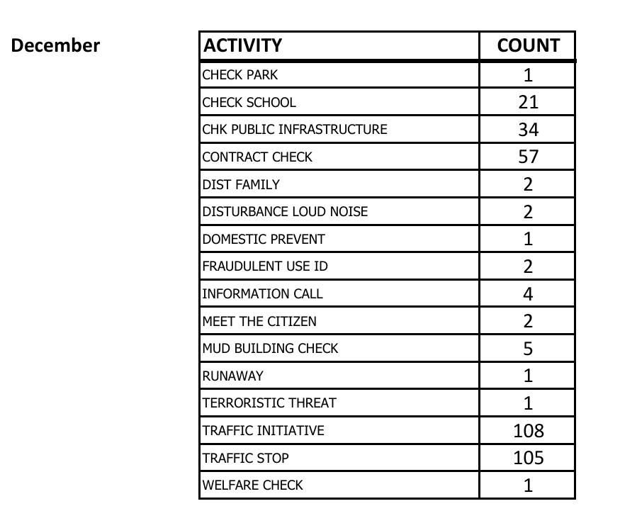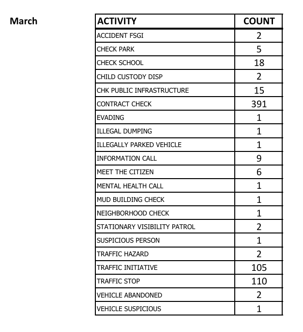 As a courtesy to our residents, the HOA is posting below an extract from the latest HCSO monthly report of the activities that occurred within the Settlement and a link to the year-to-date figures of that same information beginning with 2023.